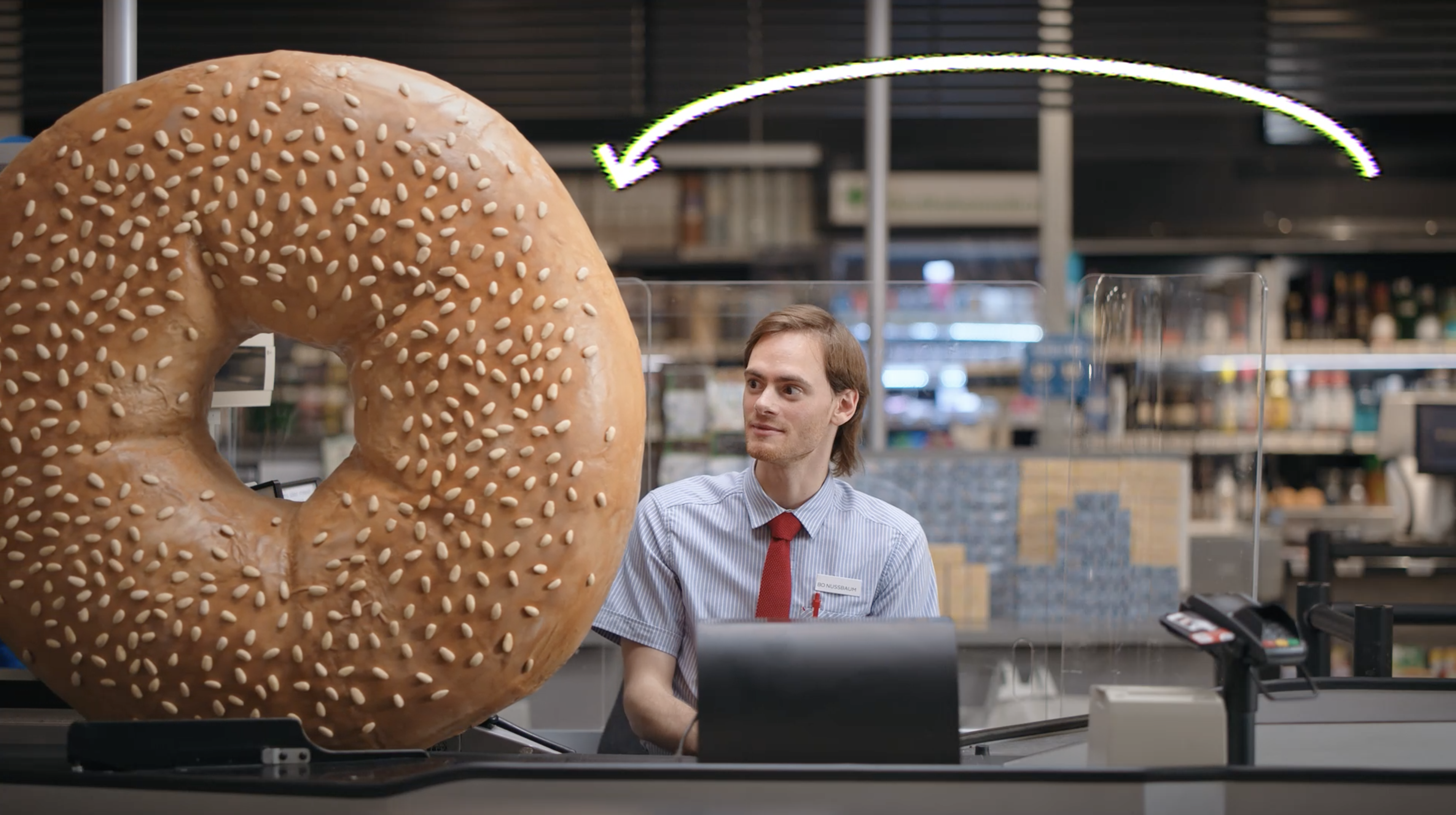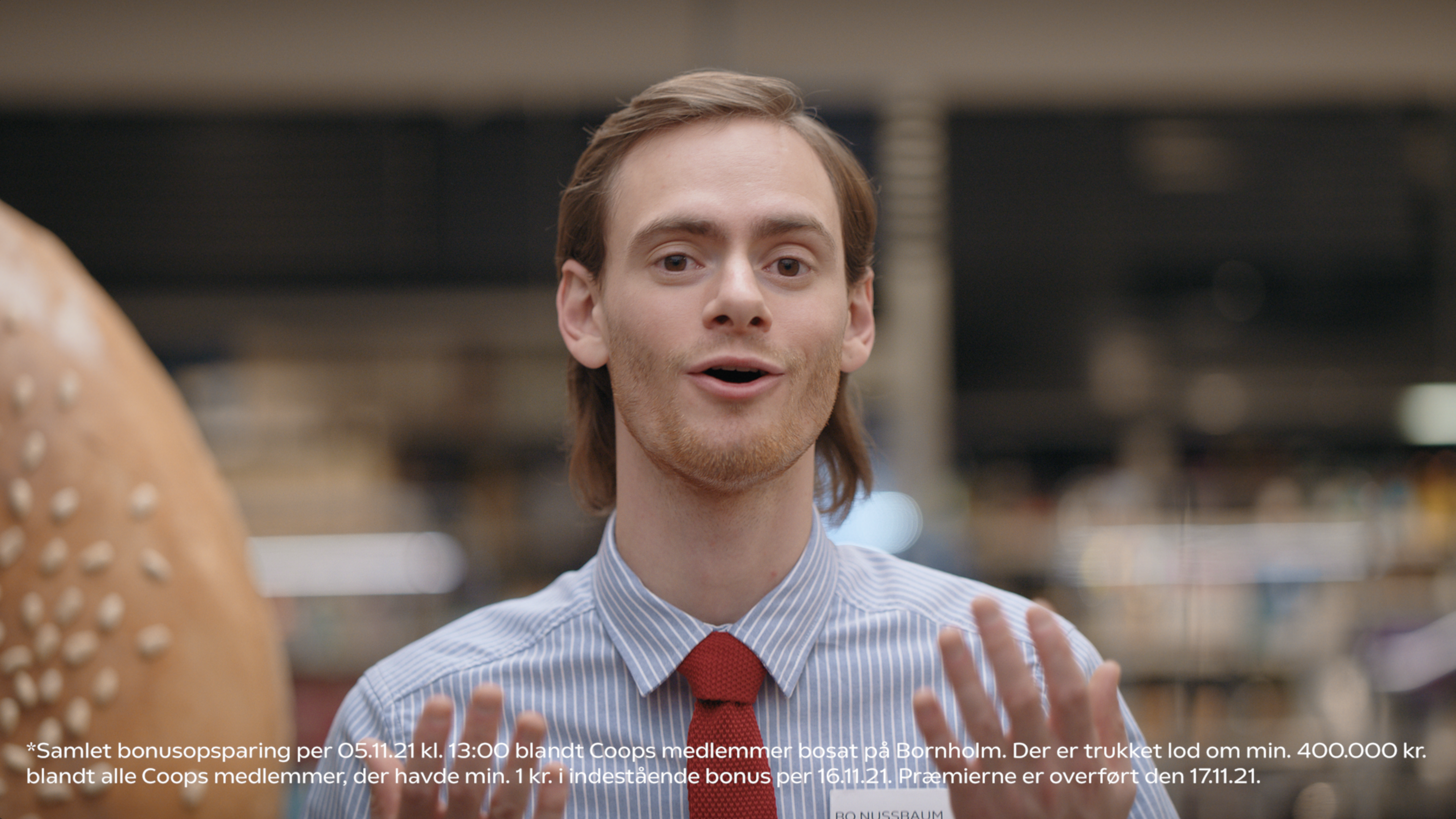 En fiktiv medarbejder ved navn Bo Nussbaum blev vores talerør. Han kunne kigge direkte i linsen og levere budskabet om de glemte bonusmillioner og lodtrækningen. En surrealistisk stor bagel hjalp ham både med at fange folks opmærksomhed og visualisere det nul medlemmerne kunne vinde.