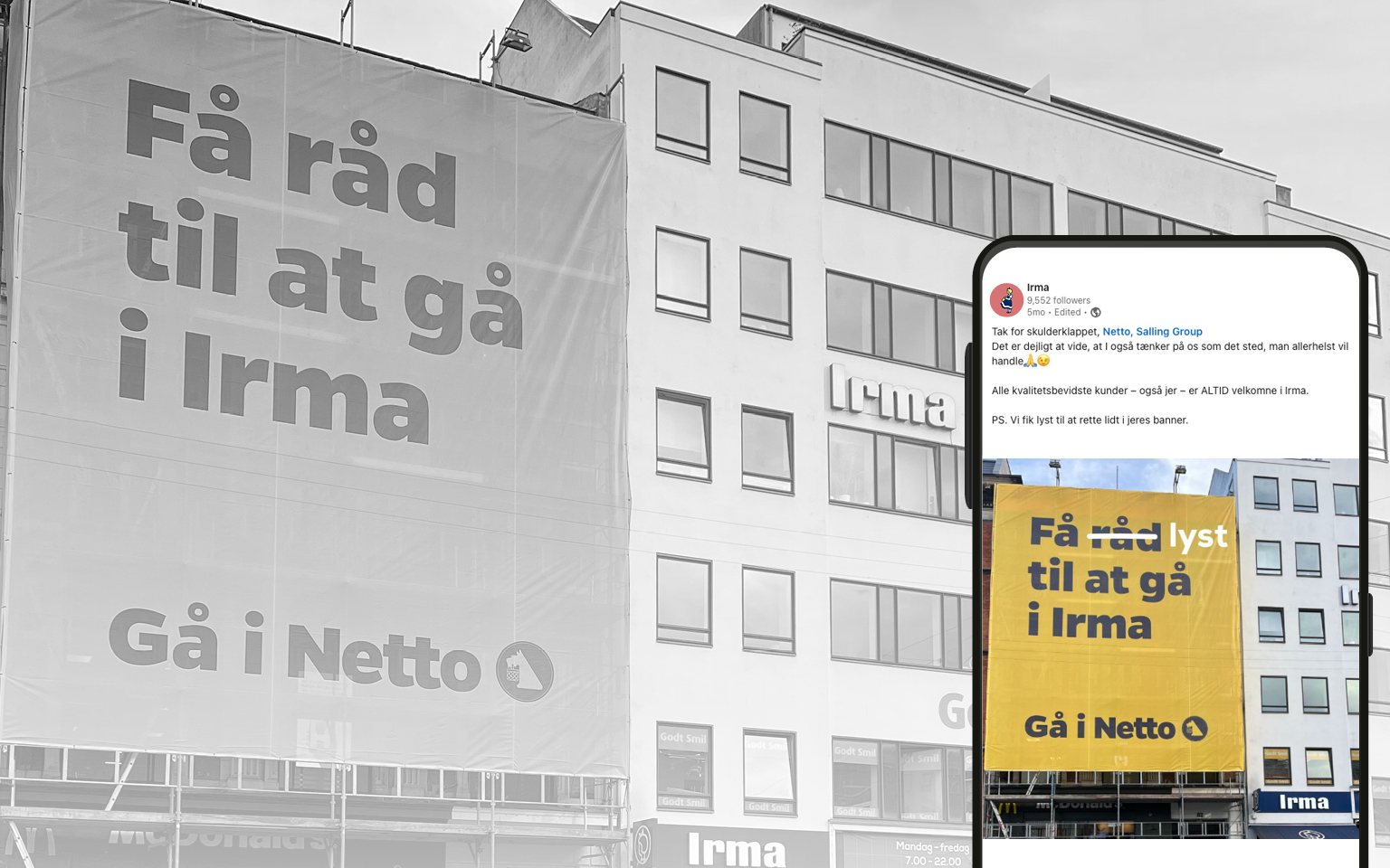 En mandag morgen opdager Irma, at Netto har placeret bannere og outdoors foran flere Irma-butikker med budskabet ”Få råd til at gå i Irma. Gå i Netto.” Som discountkæde langede Netto ud efter Irma, som altid går efter en høj kvalitet og derfor er dyrere.